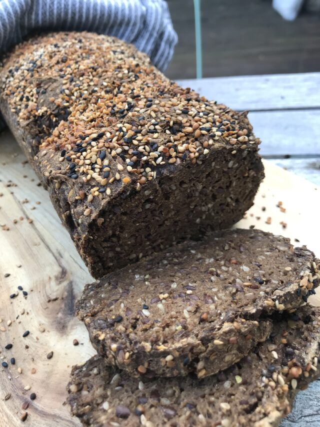 Lad derpå dejen hæve i 8 timer på køkkenbordet. Del den i 2 lige store stykker og put dejen i to smurte rugbrødsforme og drys med sesam og hampefrø. Husk at ovnen skal være helt varm når du sætter brødene ind. Bag dem i ca. 1 time og 20 minutter ved 200 grader luftovn.