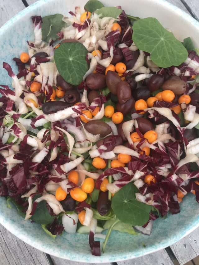 Du kan dog lade tallerkensmækker bladene være hele. Havtornene fungerer lidt som “tomater” ville gøre. Det vil sige, at de tilføjer lidt af den syrlighed, som tomater normalt vil give i en salat, men her er det en lektinfri salat, så tomater udelades.